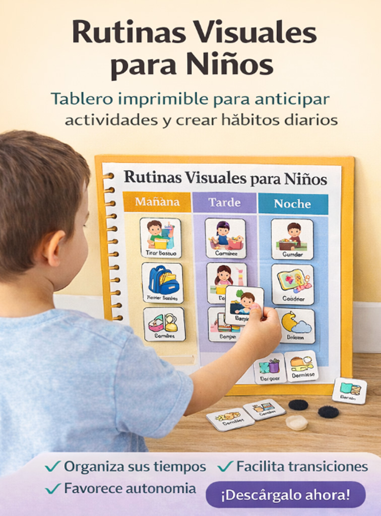 Tablero de rutinas visuales imprimible que ayuda a tu hijo a anticipar actividades, crear hábitos y sentirse más seguro durante el día.